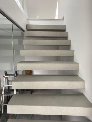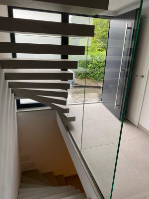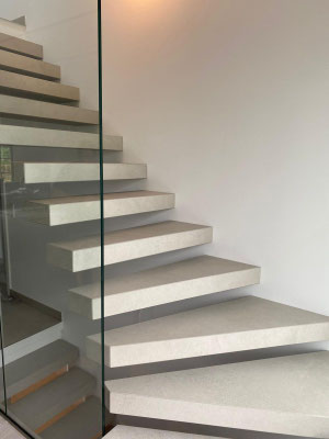Die freitragenden Stufen wurden mit hochwertiger Keramik gefertigt – robust, pflegeleicht und optisch edel. Dank der unsichtbaren Befestigung entsteht der charakteristische „schwebende“ Effekt, der den Raum offen und leicht wirken lässt.