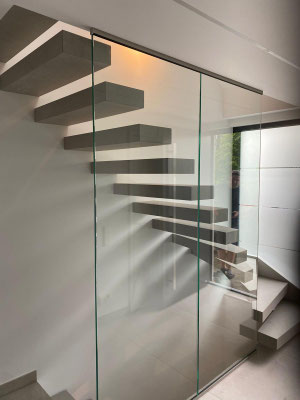 Eine großflächige Glaswand sorgt nicht nur für Sicherheit, sondern auch für maximale Transparenz und Lichtdurchlässigkeit. So bleibt der Blick frei und der Eingangsbereich wirkt hell, modern und großzügig.